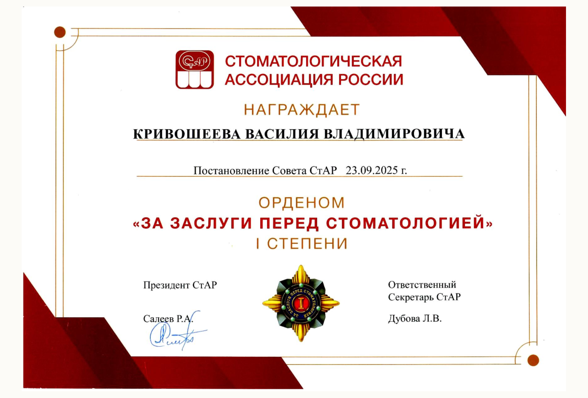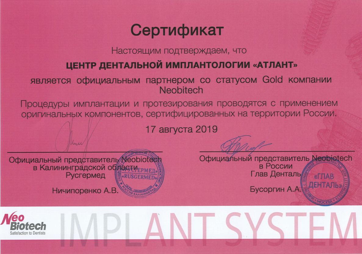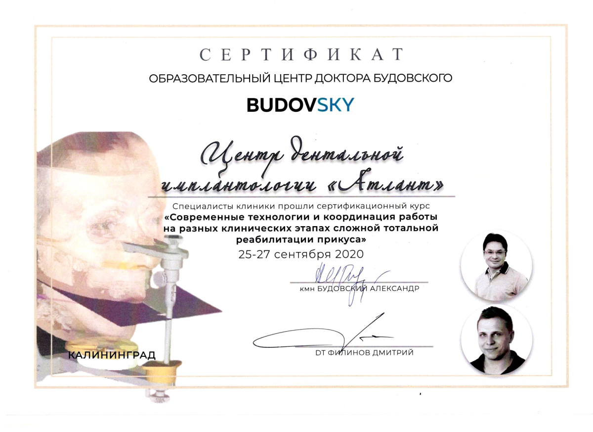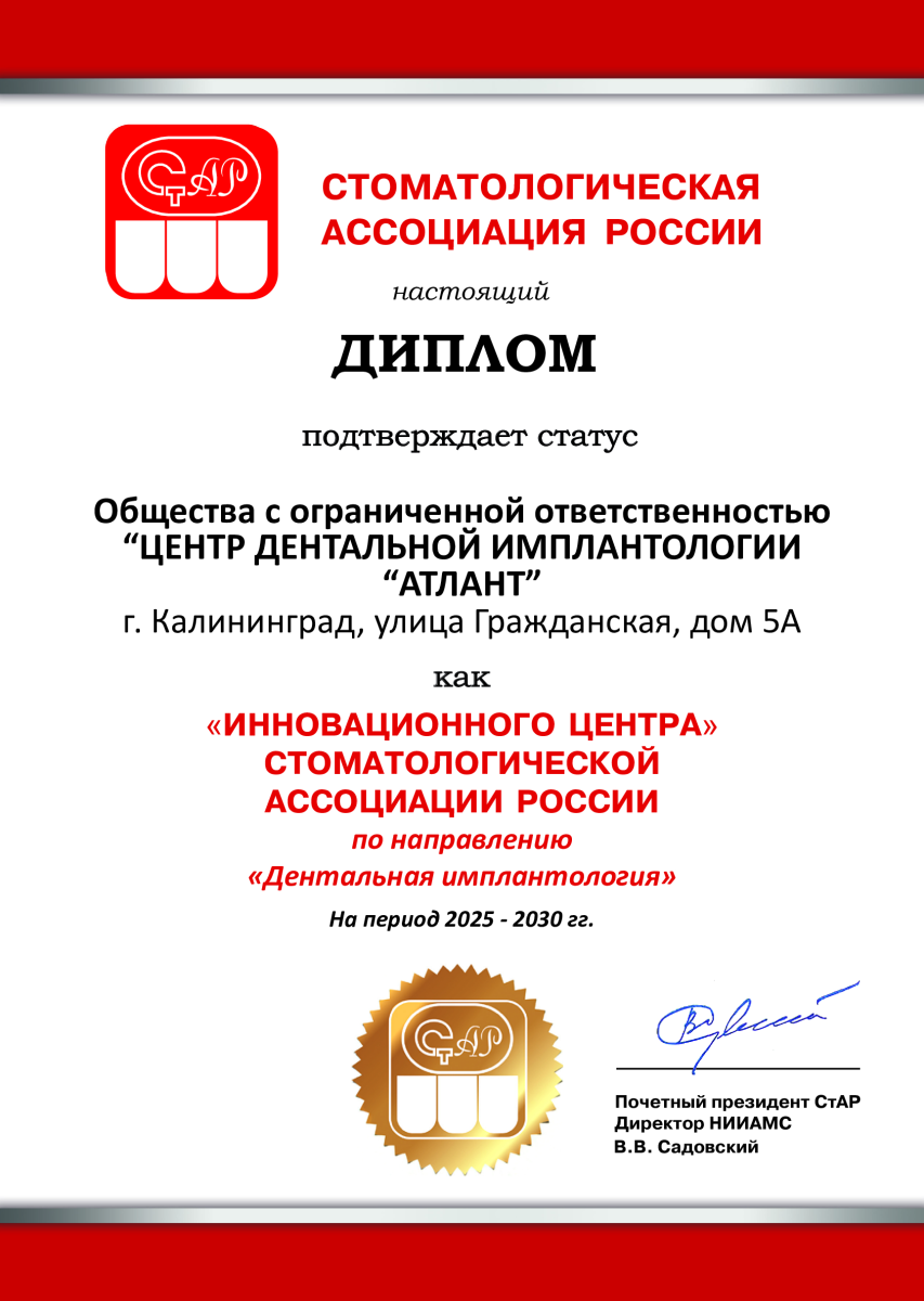 Центр дентальной имплантологии «Атлант» — клиника, основанная в 2013 году. Специализация: сложные случаи комплексной реабилитации пациентов с утратой зубов, нарушением прикуса и изменениями лицевой эстетики. Основатель и руководитель — к.м.н., челюстно-лицевой хирург Василий Владимирович Кривошеев. Эксперт в области хирургической стоматологии и имплантологии с 27-летним опытом. Ведет клиническую практику, научную деятельность и обучение врачей. «Атлант» — единственный в Калининграде Инновационный центр Стоматологической ассоциации России по направлению «Дентальная имплантология». Центр предоставляет полный спектр услуг: от терапевтического лечения и заболеваний дёсен до сложной хирургии, протезирования и реконструкции прикуса. В клинике работает команда специалистов: челюстно-лицевые хирурги, ортопеды, терапевты, ортодонты и пародонтологи. Командный подход позволяет решать задачи любой сложности через врачебные консилиумы. В основе имплантологии — авторский подход доктора Кривошеева, основанный на понимании биологических процессов заживления для прогнозируемых результатов. Центр имеет устойчивую репутацию: пациенты обращаются по рекомендации, в том числе из других регионов России и Европы. Пациенты выбирают «Атлант» за системный подход, командную работу, полный спектр услуг, прозрачное планирование (сроки и стоимость), современное оборудование и высокий сервис. Лечение строится по принципу точности, ответственности и долгосрочного результата. Важно не просто восстановить зубы, а вернуть пациенту комфорт, уверенность и качество жизни на годы вперёд.