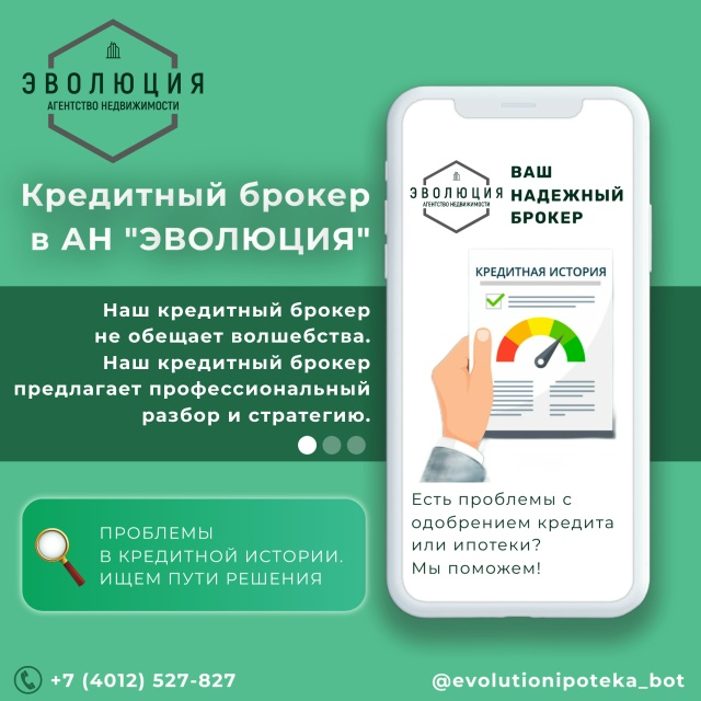 Агентство недвижимости «Эволюция» — ваш надёжный партнёр в сделках с недвижимостью в Калининграде и области. Мы помогаем купить и продать квартиры, дома, дачи и коммерческие помещения. В нашей базе — тысячи актуальных предложений на любой вкус и бюджет. Опытные специалисты подберут оптимальный вариант и сопроводят сделку от начала до конца. Мы гарантируем прозрачные условия, индивидуальный подход и высокий уровень сервиса: уже более 1 000 клиентов оценили нашу работу, соответствующую профессиональным стандартам. Доверьтесь «Эволюции» — и ваш выбор станет проще и безопаснее!