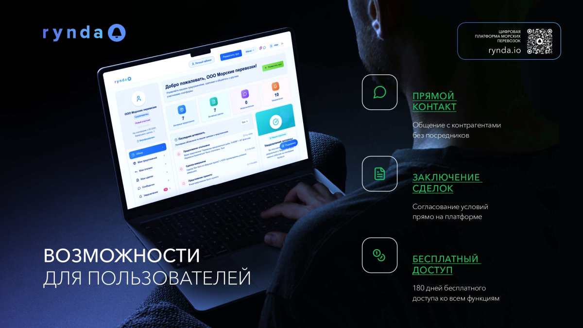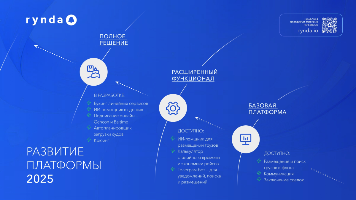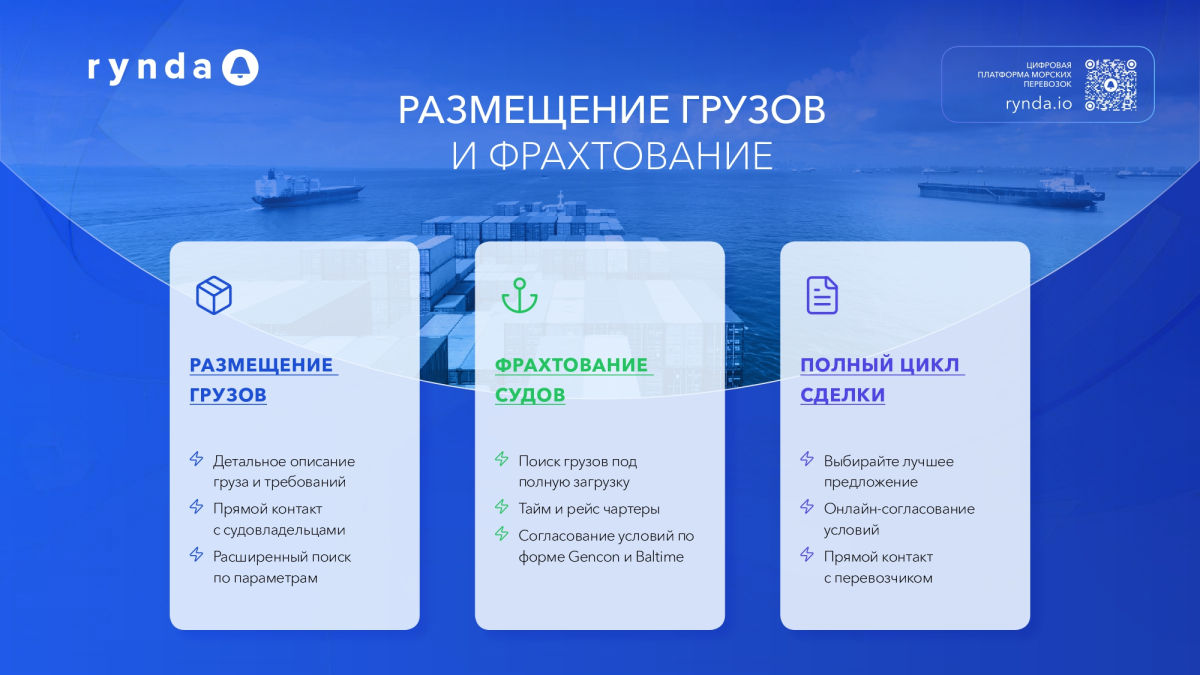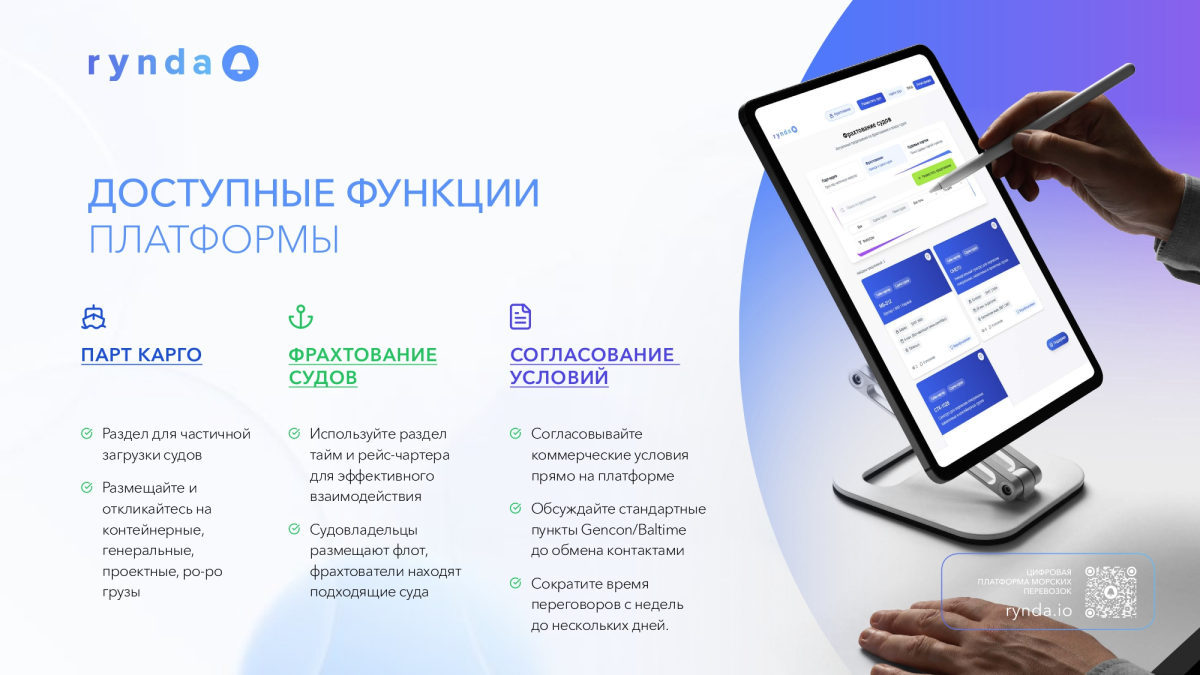 ООО «РЫНДА» — разработчик первой морской цифровой платформы России. Платформа компании представляет собой первую в РФ систему автоматизации фрахтовых операций на водном транспорте и создаёт цифровые решения для морской отрасли. Её цель — цифровая трансформация морских перевозок для ускорения глобальной торговли и укрепления национальной экономики. Решение обеспечивает фрахтовые операции для морских и речных перевозок по РФ, мониторинг рыночных ставок, прямое взаимодействие участников рынка без посредников, подбор экипажей (база анкет, фильтры, онлайн‑оформление найма). Платформа позволяет публиковать грузы и суда, подбирать рейсы и контрагентов. Предназначена для судовладельцев, грузовладельцев, морских брокеров и крюинговых компаний.