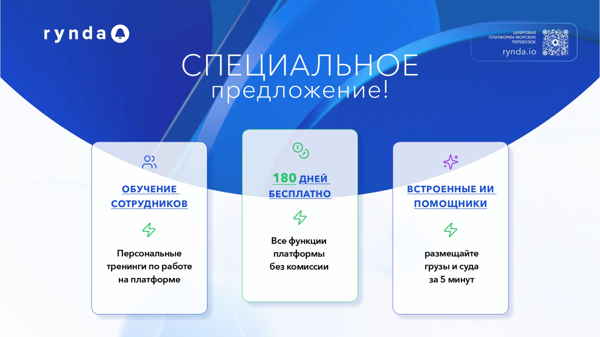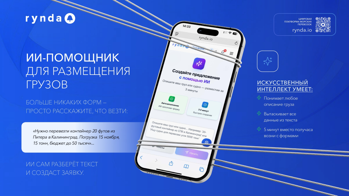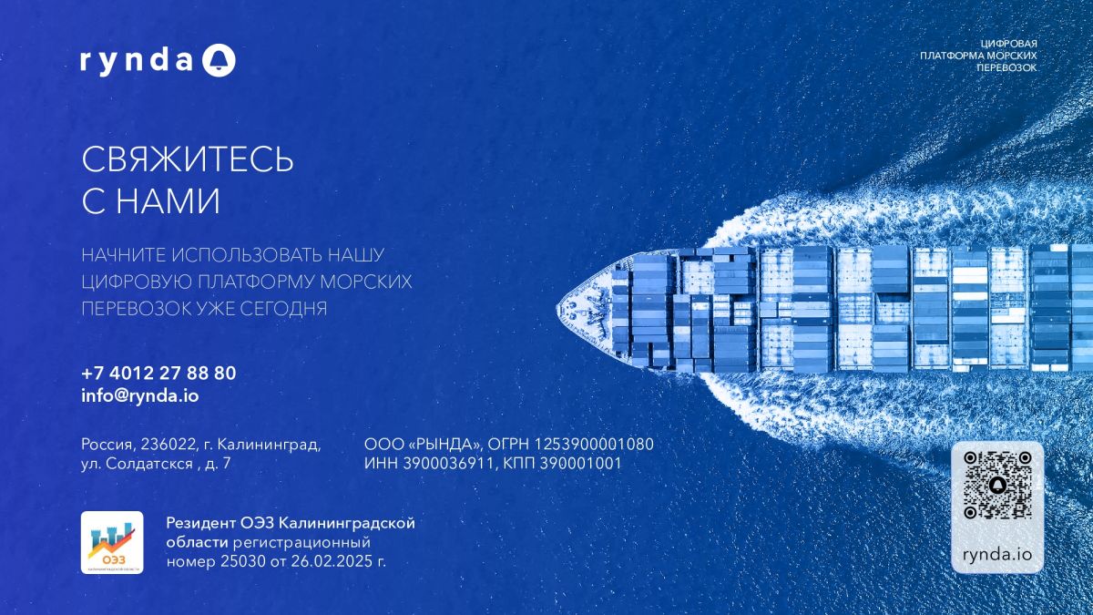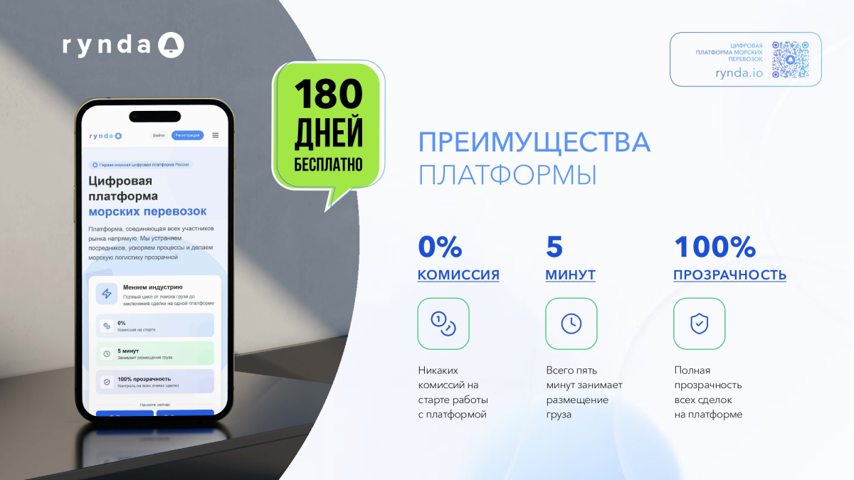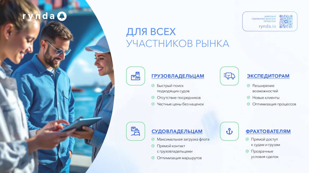 ООО «РЫНДА» — разработчик первой морской цифровой платформы России. Платформа компании представляет собой первую в РФ систему автоматизации фрахтовых операций на водном транспорте и создаёт цифровые решения для морской отрасли. Её цель — цифровая трансформация морских перевозок для ускорения глобальной торговли и укрепления национальной экономики. Решение обеспечивает фрахтовые операции для морских и речных перевозок по РФ, мониторинг рыночных ставок, прямое взаимодействие участников рынка без посредников, подбор экипажей (база анкет, фильтры, онлайн‑оформление найма). Платформа позволяет публиковать грузы и суда, подбирать рейсы и контрагентов. Предназначена для судовладельцев, грузовладельцев, морских брокеров и крюинговых компаний.
