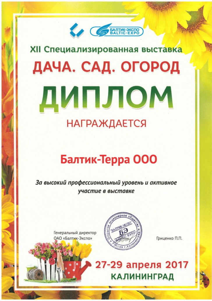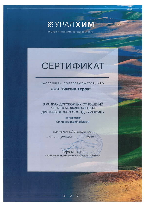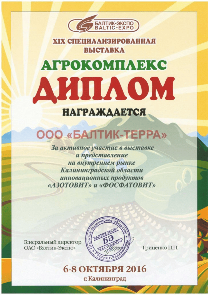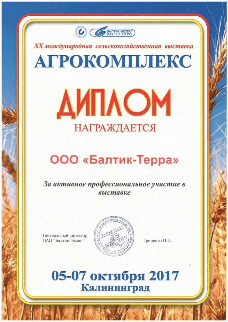ООО "Балтик-Терра" является компанией-поставщиком минеральных удобрений, микро и макро удобрений, средств защиты растений, посевного материала для местных сельскохозяйственных товаропроизводителей и активно развивает свое присутствие на внутреннем рынке в Калининградской области. Основываясь на многолетнем опыте работы, мы предлагаем аграриям региона только эффективные технологии и лучшие решения в отрасли. Для удобства наших клиентов и обеспечения оперативного обслуживания сформирована собственная сеть складских комплексов в г. Калининграде и г. Черняховске. Мы сотрудничаем с крупнейшими российскими и зарубежными заводами-производителями, что подтверждает высокий уровень нашей работы, обеспечивает постоянное развитие и движение вперед. Коллектив нашей компании — это молодые, целеустремленные специалисты, активно участвующее в аграрной жизни нашего региона. ООО "Балтик-Терра" содействует развитию и становлению сельского хозяйства нашего региона, предоставляя клиентам высокопрофессиональные услуги по поставке удобрений, средств защиты растений, зерна и технологий.
